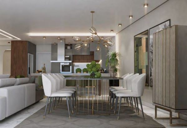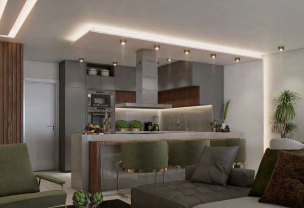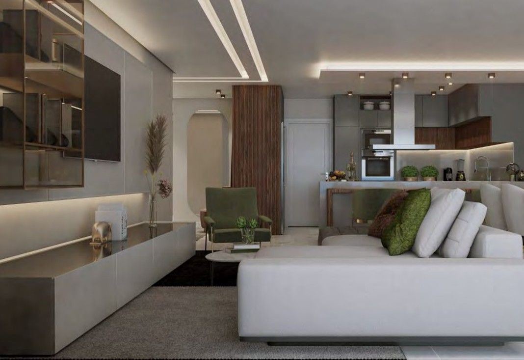 Sala ampla em open space, integrada à cozinha moderna e equipada;